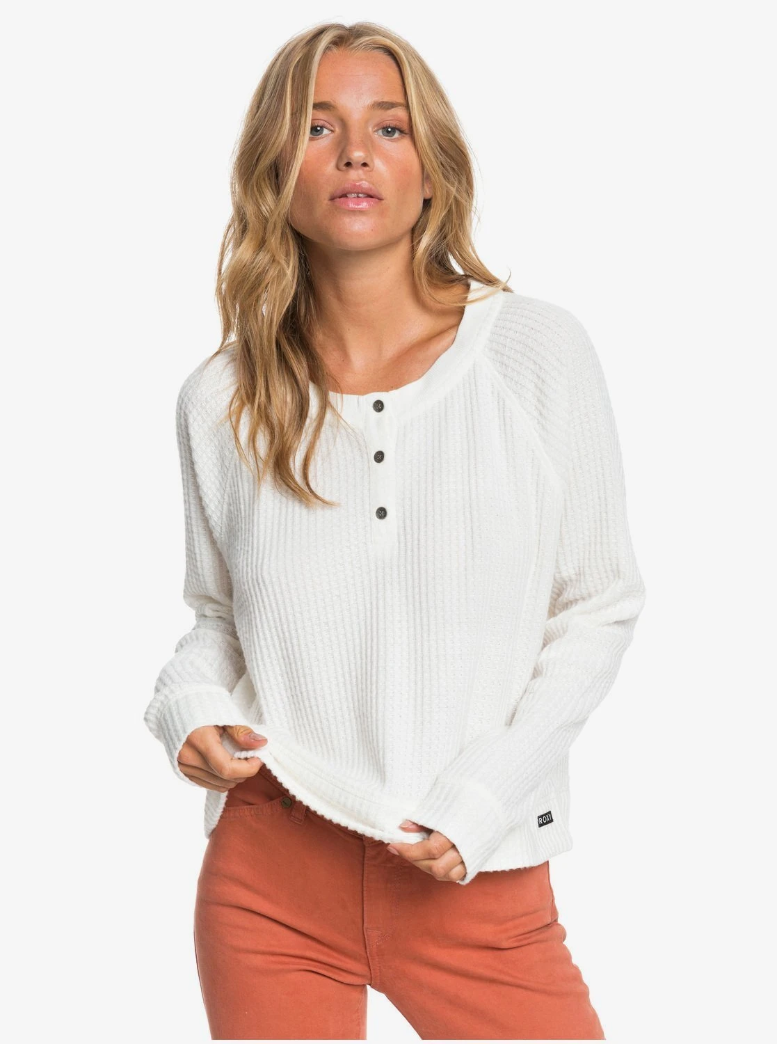 Take It Home Cosy Waffle Knit Swea T- Shirt Style : E R J K T03721 Technical Features: Fabric: Viscose polyester elastane blend cosy waffle knit fabric [240 g/m2] Fit: Casual and unrestricted relaxed fit Neck: Open neck design Button placket on front Rib knit neckline Composition67% Polyester, 29% Viscose, 4% Elastane / Womens Shirt Take It Home Cosy Waffle Knit in White / Small / Elastane/ Polyester / Roxy