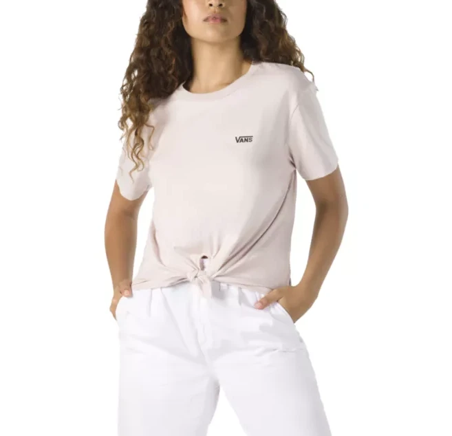 The Junior V Knot T- Shirt is a 100% heavy cotton jersey boyfriend tee with a front knot and classic logo graphics at the chest. Model is 5 feet 9 inches tall and wearing a size Small. / Womens Shirt Junior V Knot in Hushed Violet (9 P1) / X- Small / Cotton / Vans